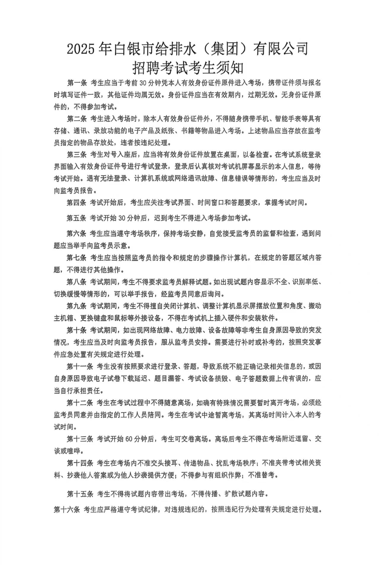 白銀市給排水(集團(tuán))有限公司關(guān)于公開(kāi)招聘考試具體事宜的通知