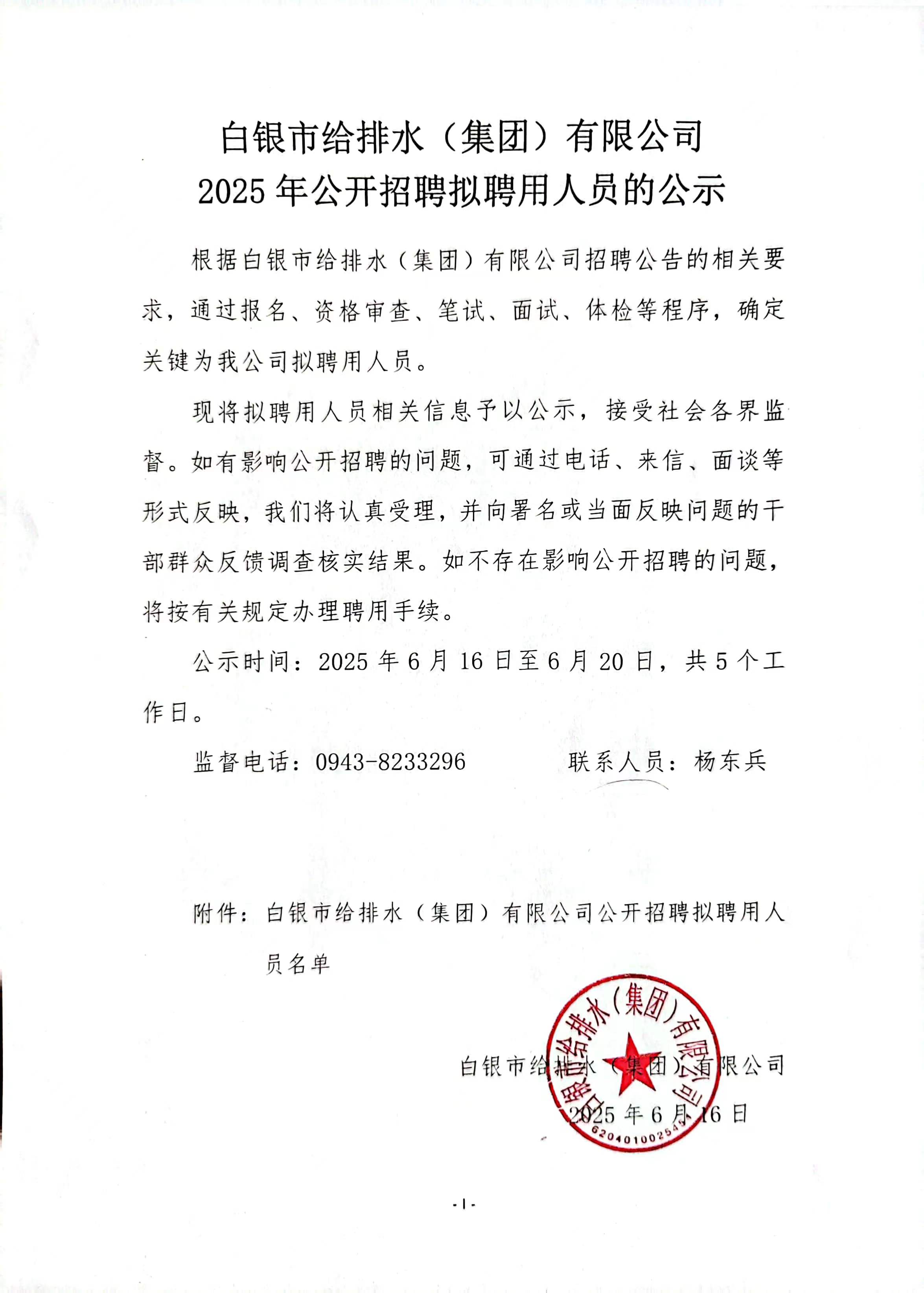 白銀市給排水(集團)有限公司2025年公開招聘擬聘用人員的公示